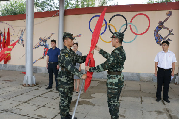 军政训练团副团长王俊力为各连队授连旗